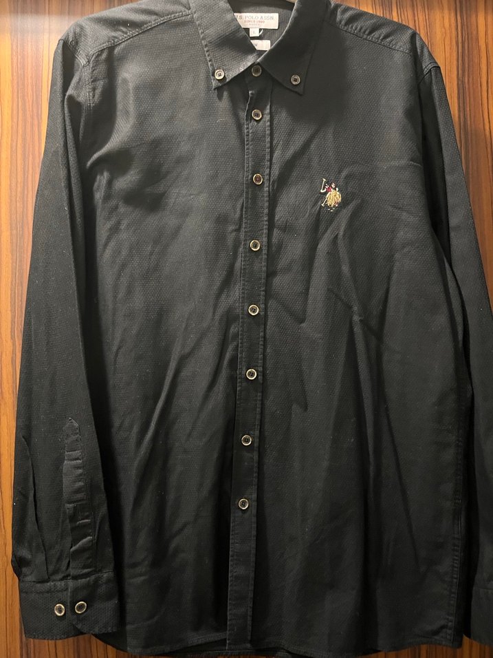 Siyah, uzun kollu, düğmeli erkek gömleği. Notch yaka ve normal kesim, sentetik kumaştan üretilmiştir. Günlük ofis kullanımı için uygundur.