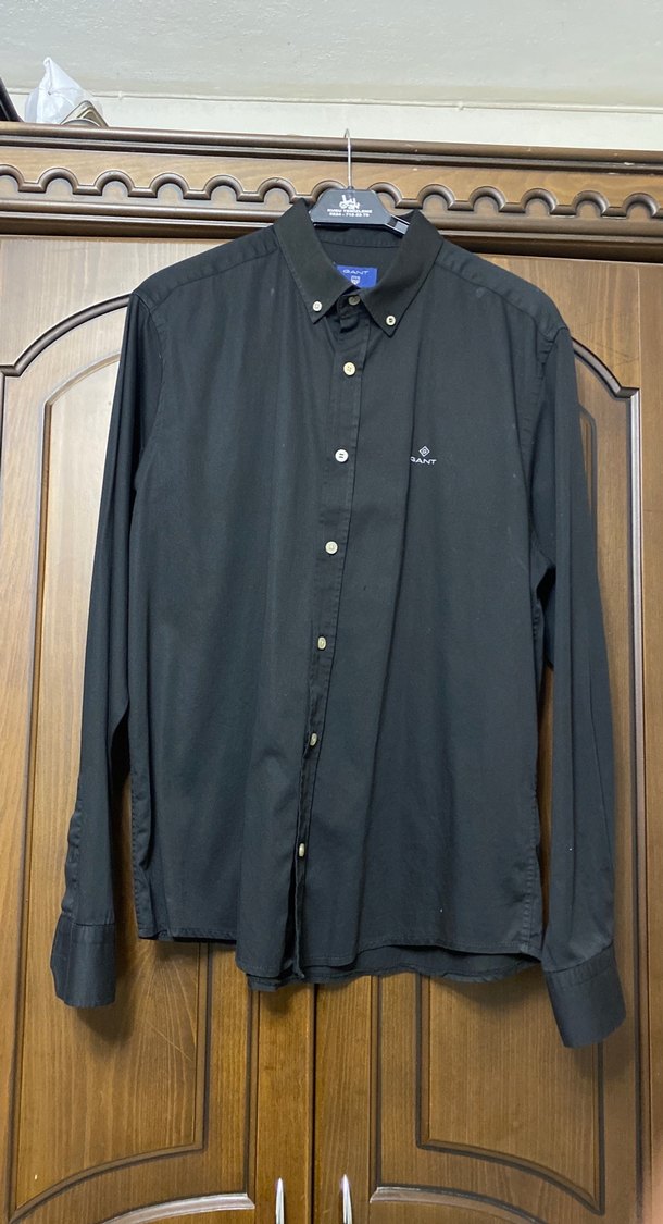 Siyah renkli, uzun kollu, notlu yakalı ve düğmeli ön kısmı olan erkek gömleği. Rahat kesimi ve sentetik kumaşıyla ofis ve günlük kullanıma uygundur.