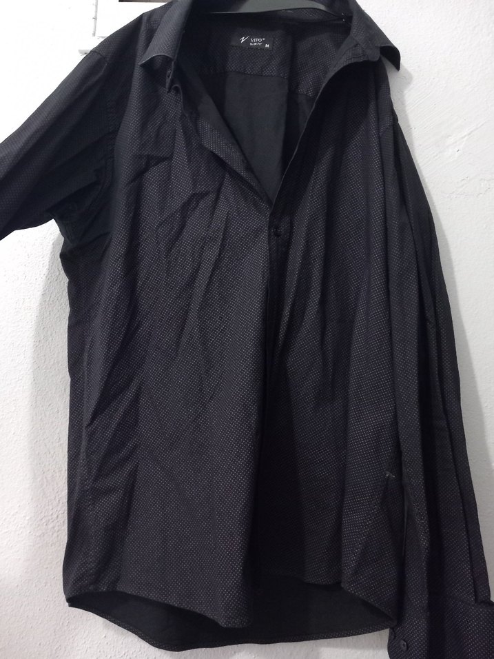 Siyah erkek gömlek, uzun kollu, yakalı ve düğmeli. Bol kesim, desensiz, ofis ve günlük kullanıma uygun.