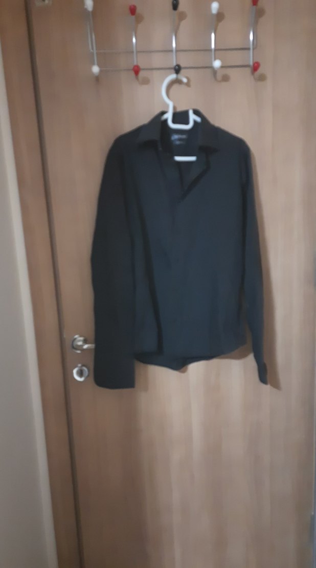 Siyah renkte, regular fit kesim, uzun kollu ve yakalı erkek gömleği. Düğmeli ön kısmı ve sentetik kumaşıyla ofis ve günlük kullanıma uygundur.