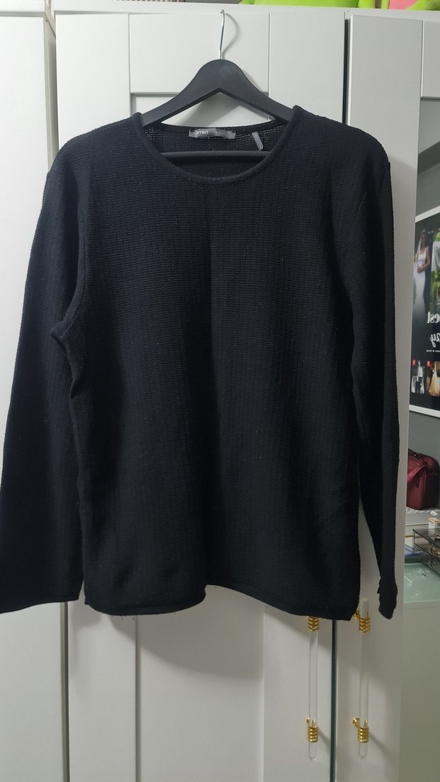 Siyah, yuvarlak yakalı, uzun kollu, yumuşak yün dokulu, rahat kesim erkek triko kazak. Günlük kullanıma uygun, minimal ve sade tasarım.