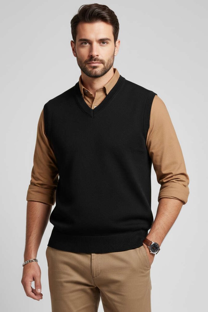 Siyah yün, v yaka, kolsuz ve regular fit erkek süveter. Ofis için şık ve rahat bir seçim.