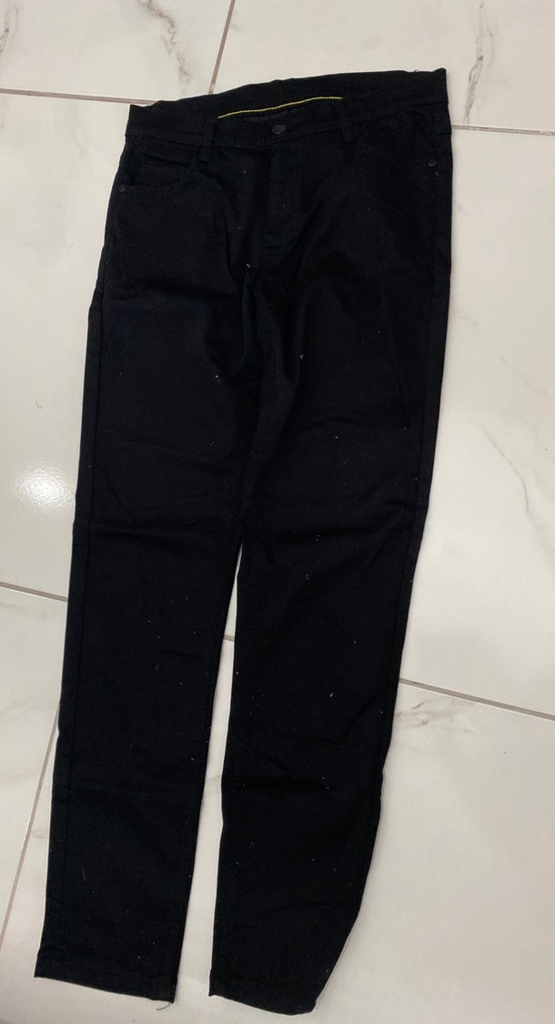 Siyah, erkek kumaş pantolon. Yumuşak sentetik kumaştan, günlük kullanım için rahat ve şık görünümlü.