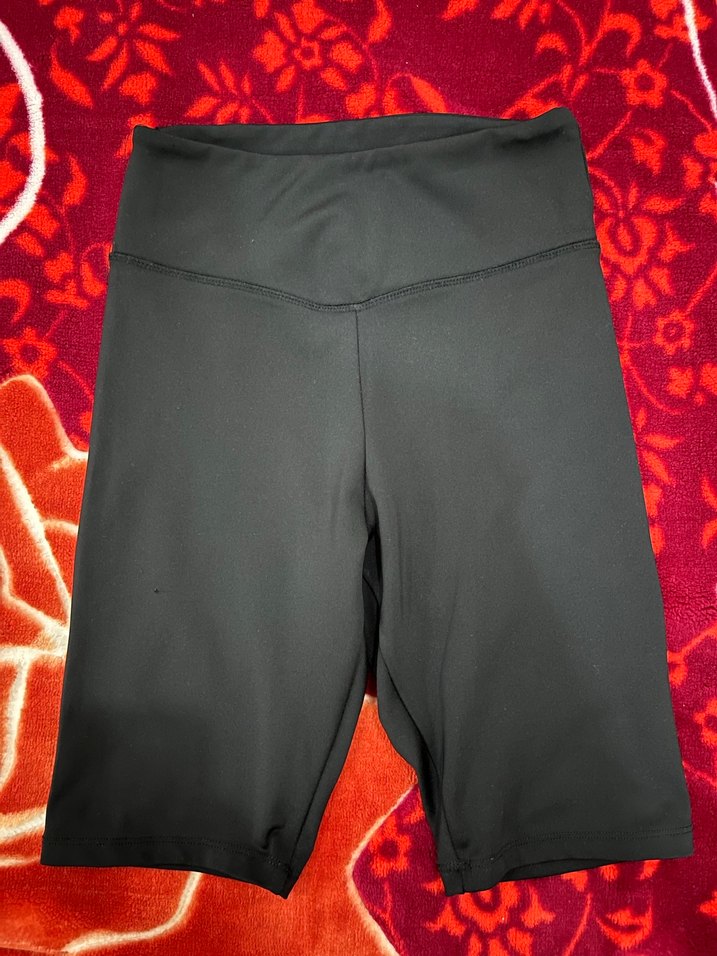 Siyah, esnek belli, düz desenli hamile midi şort. Sentetik kumaştan, spor ve sokak giyimi için uygun, vücuda oturan kesimde.