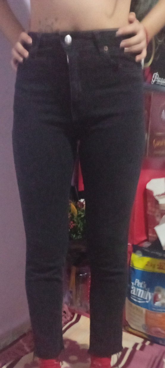 Siyah, esnek sentetik kumaştan, normal midi boyda, dar kesim kadın kot pantolon. Günlük kullanıma uygun.