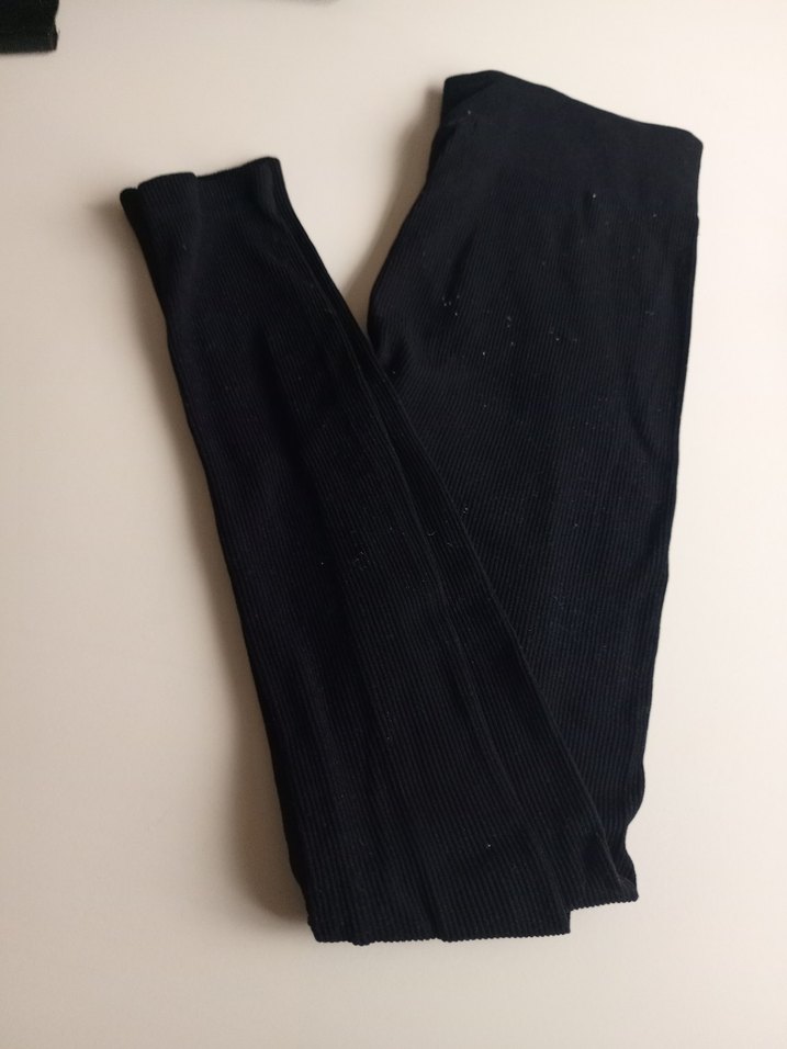 Siyah, esnek sentetik kumaştan yapılmış, boy ve dar kesim kadın tayt. Günlük sokak tarzı için uygundur.