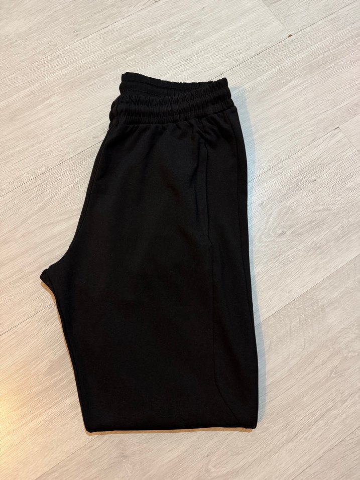 Siyah eşofman altı, yumuşak sentetik kumaştan, spor ve günlük kullanım için sade ve şık.