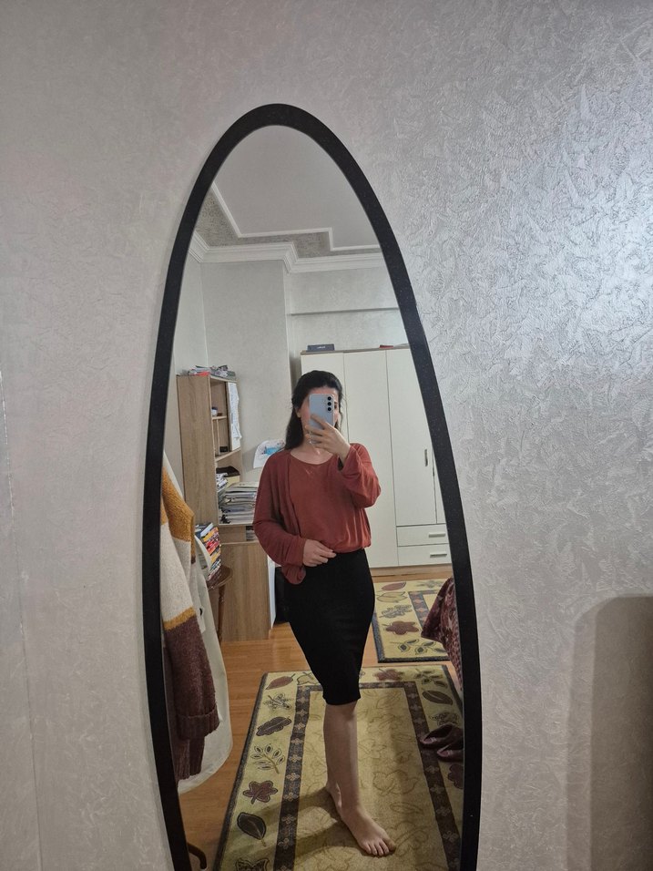 siyah etek , mini sayılmaz diz kapağının hemen altında, tok bir kumaşı var kalem etek gibi vücudu sarıyor.