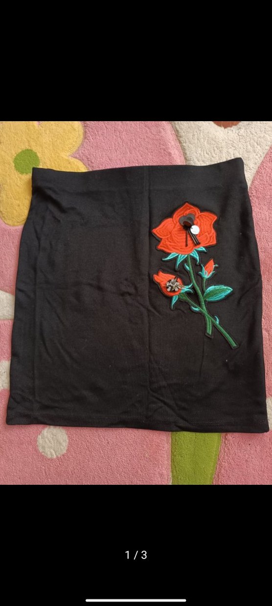 Düğmeli, nakışlı çiçek detaylı siyah, vücuda oturan etek. Romantik akşamlar için uygundur. ufak bi kusuru var göze çarpmıyor