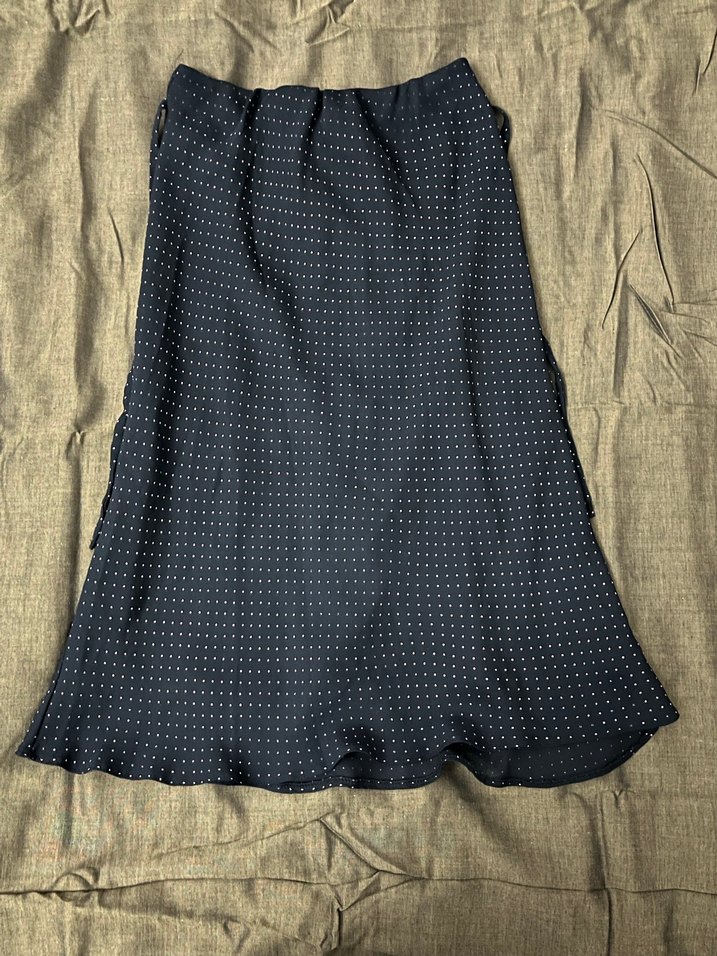 Etek siyah renkli pembe puantiyeli, uzun, bol kesim ve drapeli puantiyeli etek. Günlük kullanım için uygun, Paris normcore tarzında.