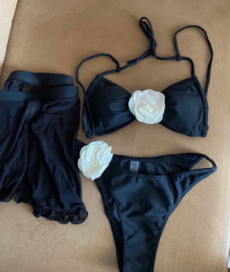 Siyah, s beden vücudu saran mini bikini set, askılı üst ve beyaz çiçek detaylarıyla plajda şık ve modern bir görünüm sunar. Hiç giyilmemiştir- defosuzdur- aynı gün kargo