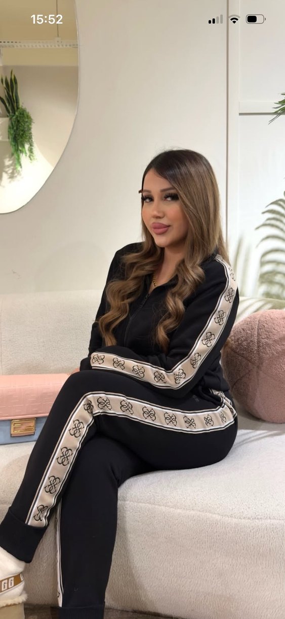 Uzun kollu, V yakalı siyah kadın eşofman takımı, etnik desenli dantel detaylarıyla, sentetik kumaştan, rahat ve uzun kesimdir.bir kez giyildi etiketi duruyor