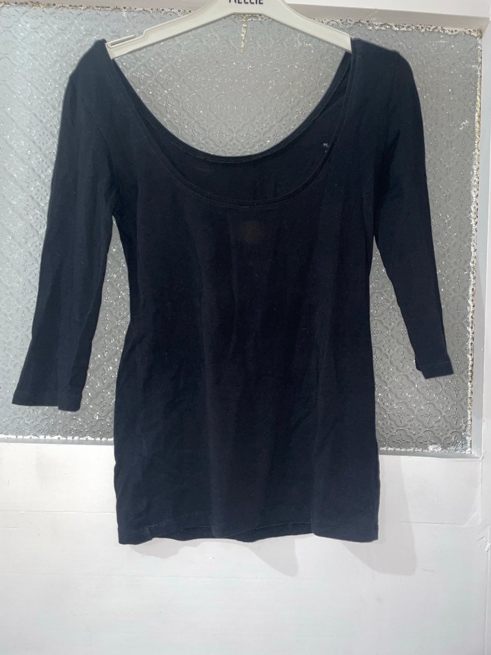 Siyah, fakir kollu, derin yuvarlak yaka ve dar kesim kadın bluz. Yumuşak kumaştan, minimalist ve gotik tarzda, günlük kullanıma uygun.