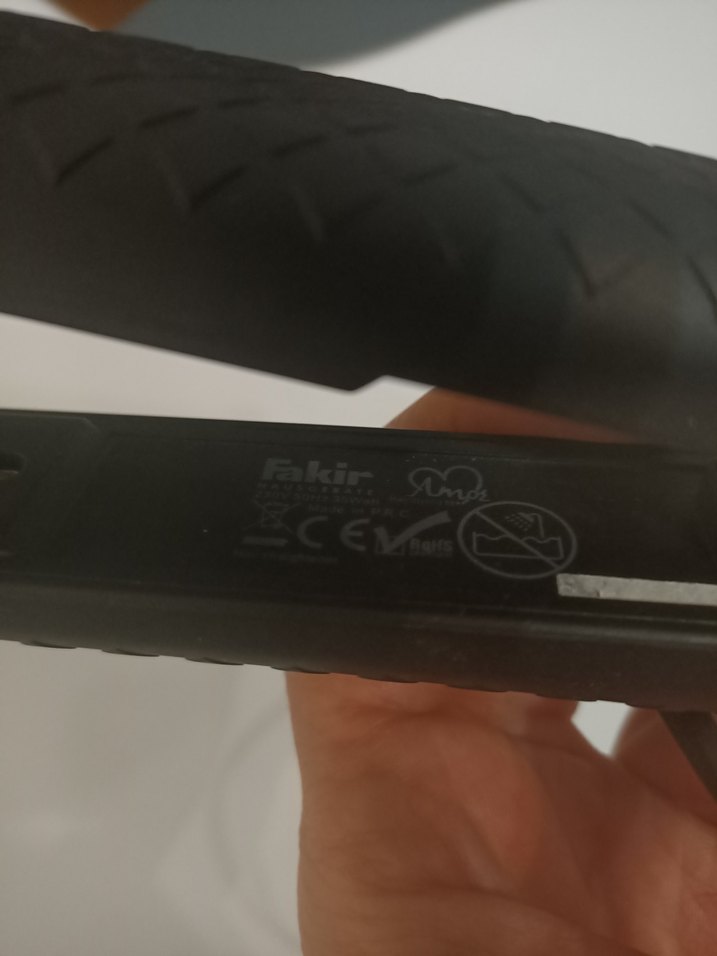Siyah renkli Fakir saç düzleştirici, dokulu tutuş ve kompakt tasarıma sahiptir. Üzerinde güvenlik sertifikaları ve sembolleri bulunur. ♀️