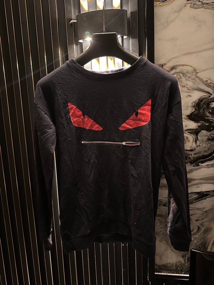 Siyah yumusak kumaştan uzun kollu, bisiklet yaka ve baskılı kırmızı göz desenli, fermuarlı sweatshirt. Günlük sokak stili için uygun.