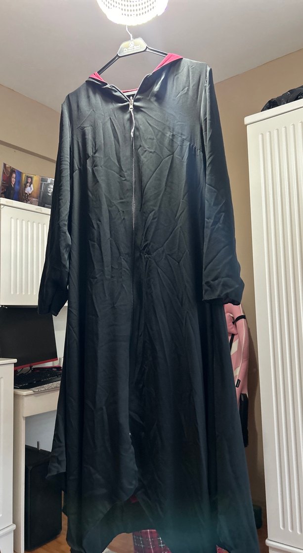 Uzun, bol kesim siyah ferace , uzun kollu ve fermuarlı ön detaylıdır. desensiz ve koyu renklidir.