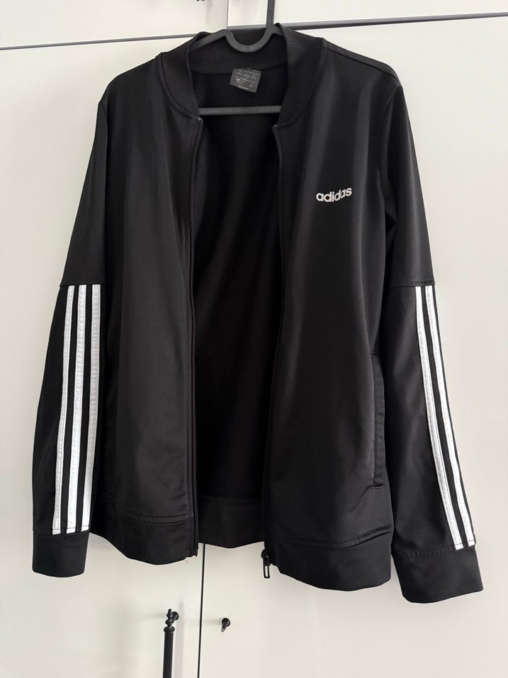 Bu siyah Adidas kadın ceket, uzun kollu ve yüksek yakalı, fermuarlı eşofman takımı