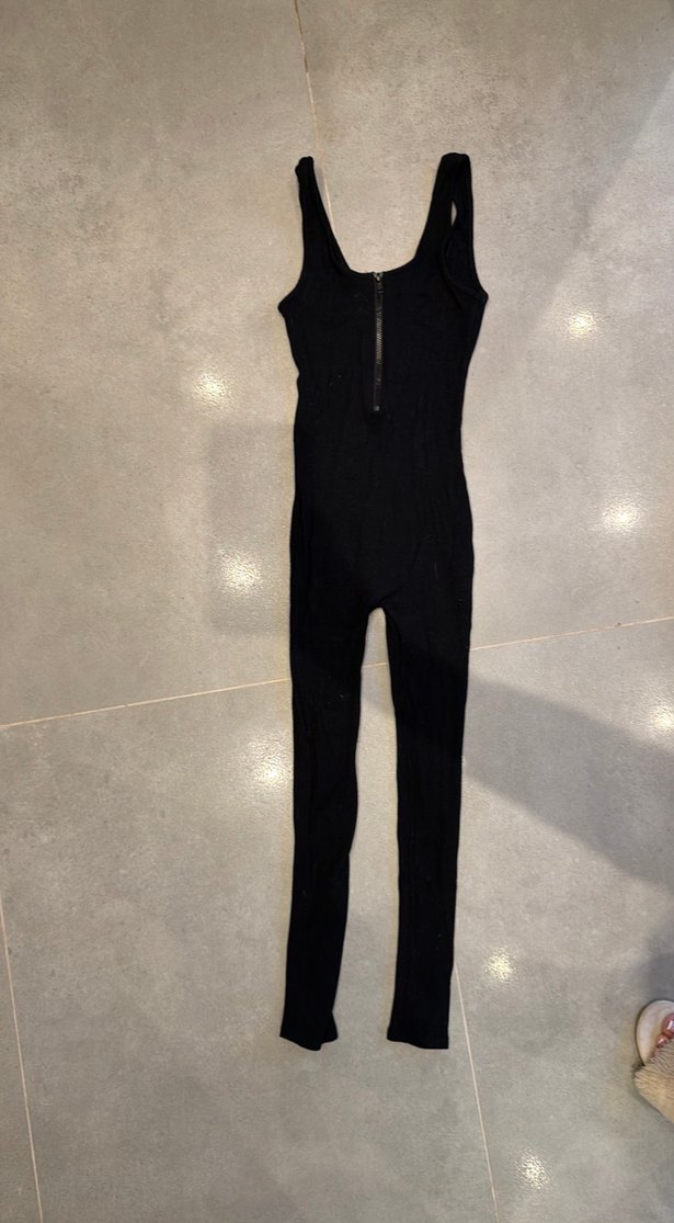 Siyah, dar kesim tulum yüksek yaka ve ön fermuar detayına sahiptir. Pürüzsüz sentetik kumaştan yapılmış, atlet tarzı ve günlük kullanım için uygundur. Kolsuz ve midi boydur.