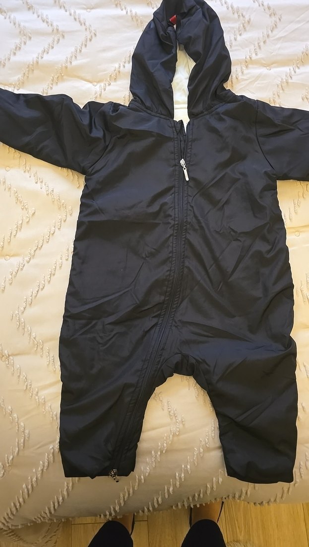 Siyah renkli, fermuarlı ve içi yumuşak kumaşla kaplı bebek kayak tulumu, sokak giyimi tarzında rahat ve sıcak tutar. ❄️