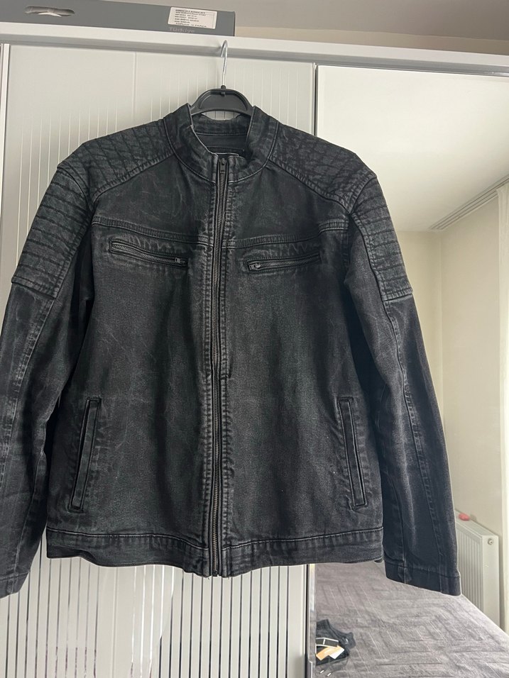 Siyah fermuarlı biker denim ceket, notalı yaka ve cep fermuarlarıyla. Koyu denimden, regular fit ve uzun kollu, günlük kullanıma uygun.