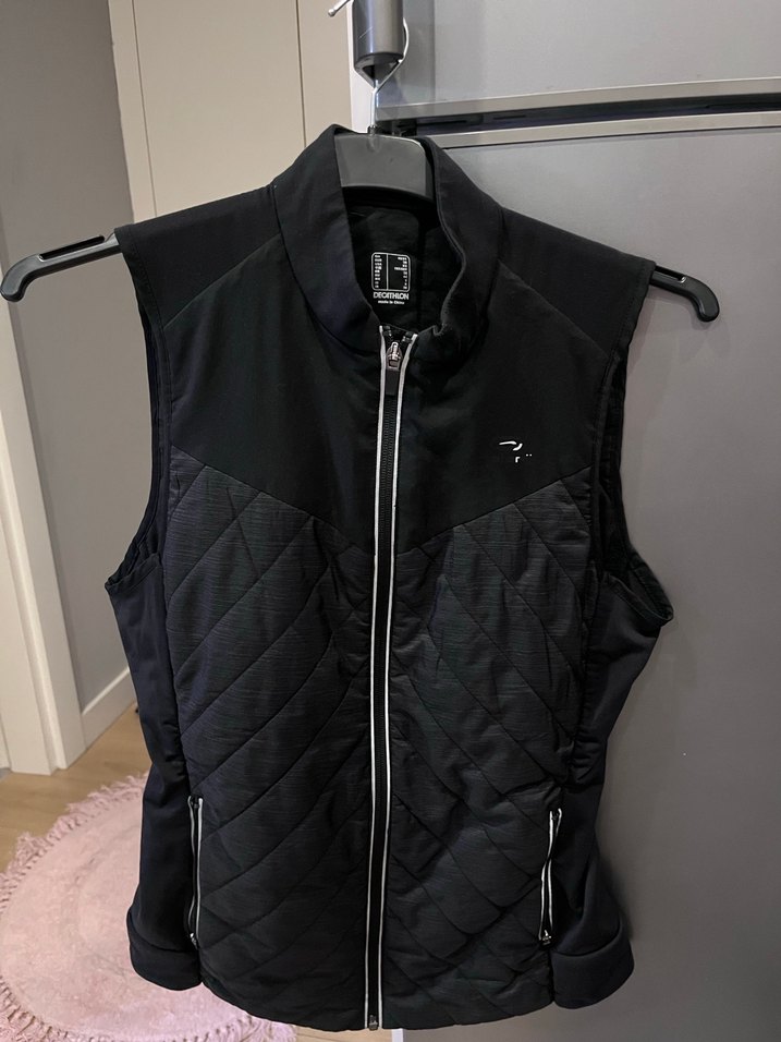 Siyah, fermuarlı, biker tarzı, yüksek yakalı ve kolsuz, vücuda oturan kadın yelek. Günlük athleisure stil için uygundur.