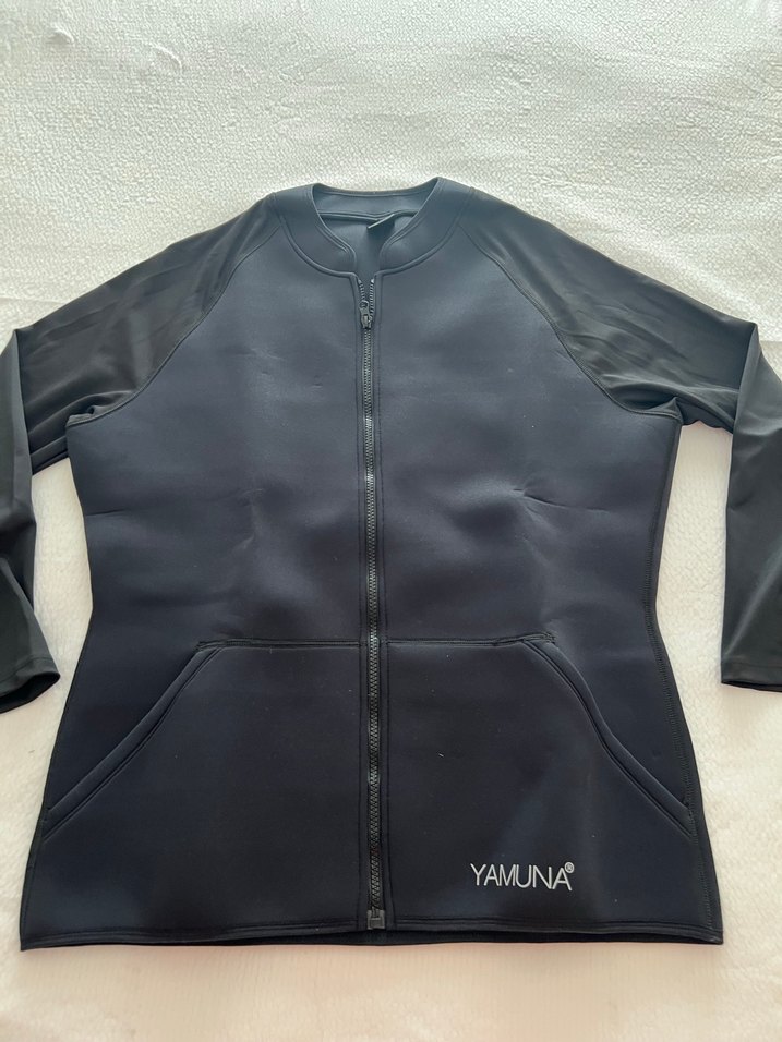 Siyah, fermuarlı ve uzun kollu ceket. Sentetik kumaştan, normal midi boyda, iki cepli ve "YAMUNA" logosu detaylı. Sporda evde özellikle yürüyüşte sauna üst ceket