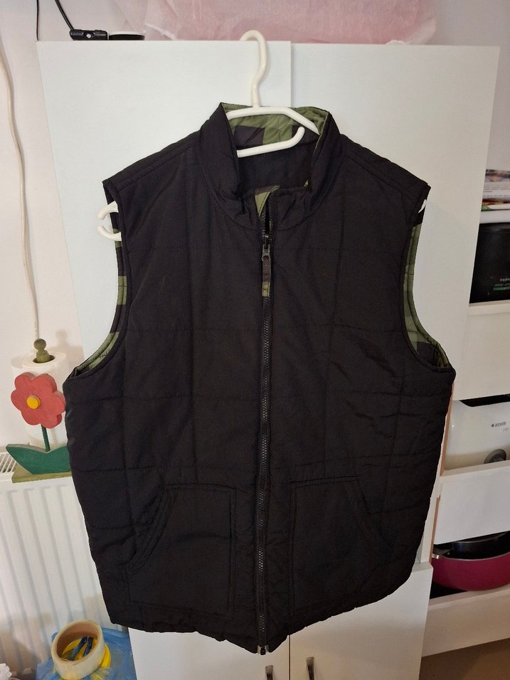 Siyah fermuarlı ve çift taraflı giyilebilen, yumuşak kumaştan erkek yelek. Rahat kesim ve normal boyda, günlük sokak modasına uygun.