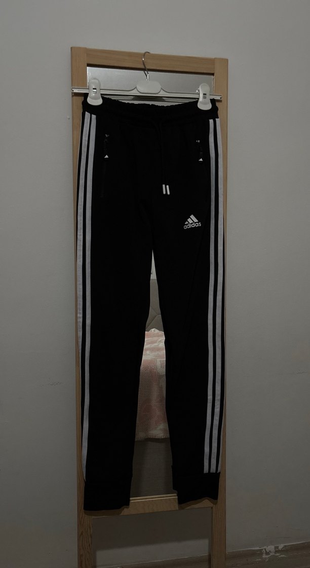 Yandan beyaz çizgili, fermuarlı cepli siyah kadın eşofman altı. Yumuşak ve sıcak kumaştan, spor ve günlük kullanıma uygun