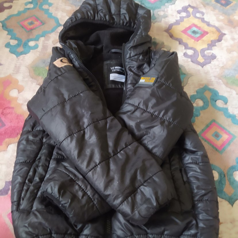 Siyah renkli, fermuarlı ve normal uzunlukta çocuk kışlık mont Notch yaka ve uzun kollu, rahat ve sıcak kumaştan üretilmiştir.
