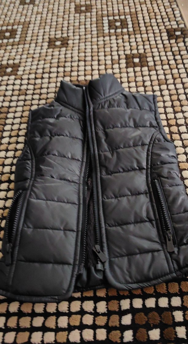 Fermuarlı cepleri ve yüksek yakası olan, sentetik kumaştan yapılmış, siyah ve ince kesim çocuk yeleği. Günlük rahat kullanıma uygundur.