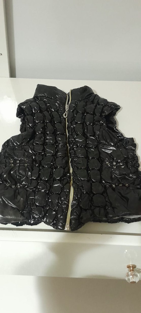 Fermuarlı ön kısmı ve boğazlı yakasıyla siyah, kısa ve dar kesim kadın yelek. Sentetik dokulu kumaştan, gotik ve avangart tarzlar için uygun.