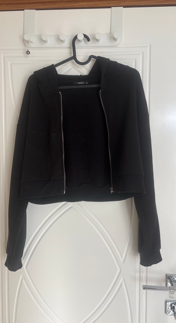 Siyah renkli, fermuarlı ve yüksek yakalı, uzun kollu, vücuda oturan kadın sweatshirtü. Yumuşak ve sıcak kumaştan üretilmiştir, günlük rahat kullanım için uygundur.Addax m beden tamamen göründügü gibi her sey.
