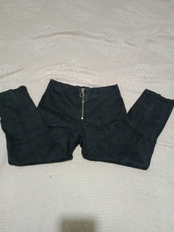 Önden fermuarlı, dar kesim siyah denim kot pantolon. Midi boy ve gündelik sokak stili için uygun.