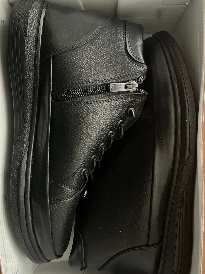 Siyah deri biker botlar, kolay giyimi sağlayan yan fermuar ile. Sokak stiline uygun, günlük kullanıma dayanıklı ve şık.
