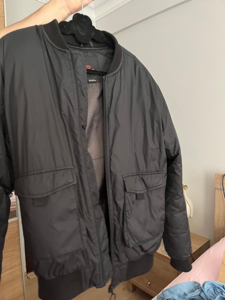 Siyah, fermuarlı, uzun kollu, yumuşak ve sıcak kumaştan yapılmış, kesimli erkek ceket, yakasında çentikli detay ve sokak stili görünümü ile.Çok iyi durumda deforme yırtık vs yok.