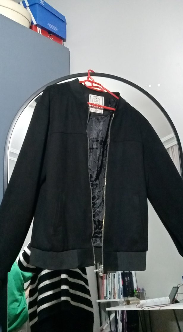 Siyah renkli erkek ceketi, fermuarlı ve notched lapel yakalıdır. Uzun kollu, boy ve rahat kesimdir, yumuşak ve sıcak kumaştan üretilmiştir.