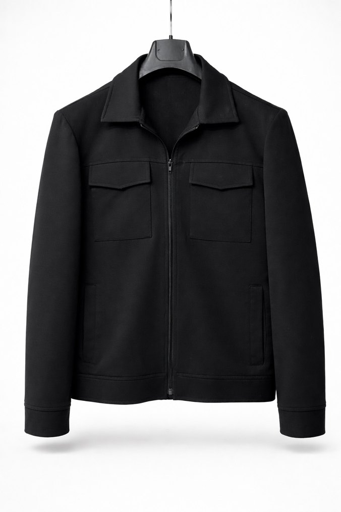 Siyah renkli, fermuarlı erkek ceket. Normal kesim, uzun kollu ve yakası notched lapel. Yumuşak ve sıcak kumaştan, günlük kullanıma uygun.