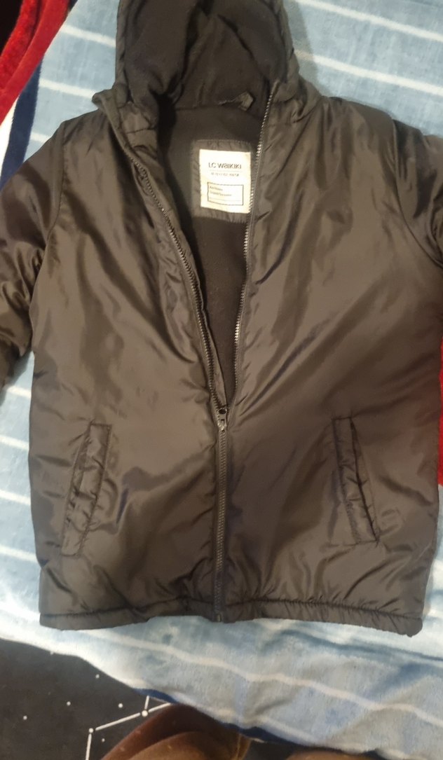 Fermuarlı ve bisiklet yaka, siyah renkli, yumuşak ve sıcak kumaştan yapılmış erkek çocuk montu. Sokak stiline uygun sade tasarım. orta kalınlık