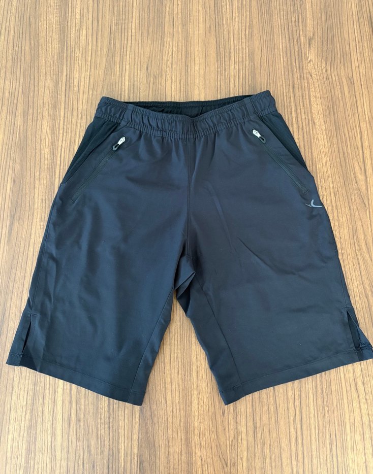 Düz siyah, fermuarlı cepleri olan, arkasında file detaylı rahat kesim spor şortu, sentetik kumaştan, sokak stili ve spor için uygundur. #decathlon #spor #şort