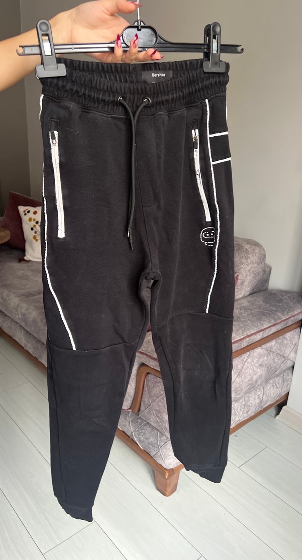 Fermuarlı cepleri ve beyaz şerit detayları olan, sentetik kumaştan üretilmiş siyah, dar kesim erkek eşofman altı. Bel:26 iç bacak boy:60