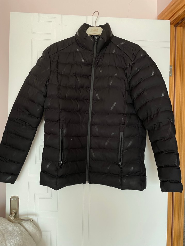 Fermuarlı önü ve uzun kollu, siyah renkli, sentetik kumaştan yapılmış, normal midi boyda, erkekler için günlük sokak stili mont.