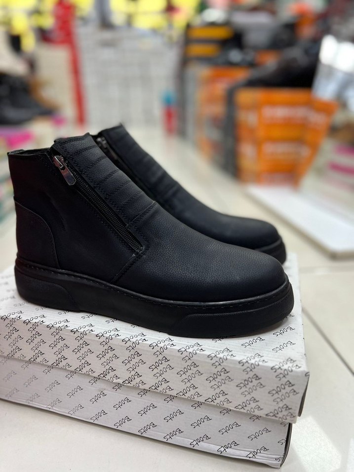 Fermuarlı, siyah kauçuk erkek bot, trend sokak tarzına uygun. Günlük kullanıma uygun, desensiz koyu renkte bir model.