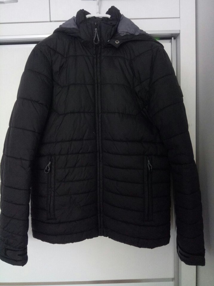 Siyah, fermuarlı, uzun kollu ve kesimli erkek kışlık ceket. Yumuşak ve sıcak kumaştan, günlük kullanım için uygun.Ön tarafında fotoğraf ta görüldüğü kadar küçük bir boya lekesi var.