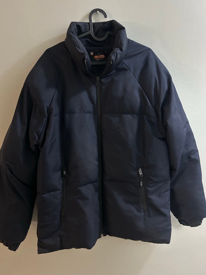 Lacivert renkli, fermuarlı, yüksek yakalı ve uzun kollu kışlık mont. Orta boy ve sade tasarıma sahip, dış mekan kullanımı için uygundur.