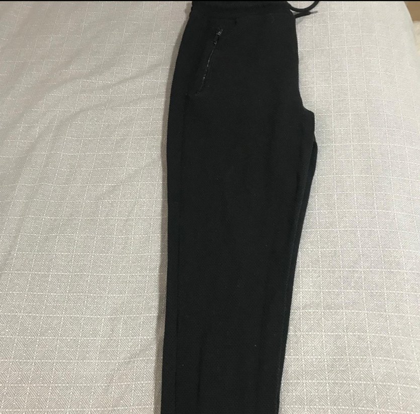 Fermuarlı cepleri ve midi boyu ile siyah, dar kesim kadın pantolon. Yumuşak sentetik kumaştan, günlük sokak stili için uygundur.