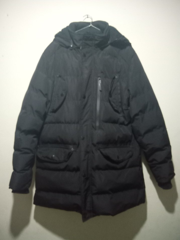 Fermuarlı cepleri ve kesik yaka detayı olan, uzun kollu siyah erkek mont. Yumuşak ve sıcak kumaştan, sokak stili ve dış mekan kullanımı için uygun.
