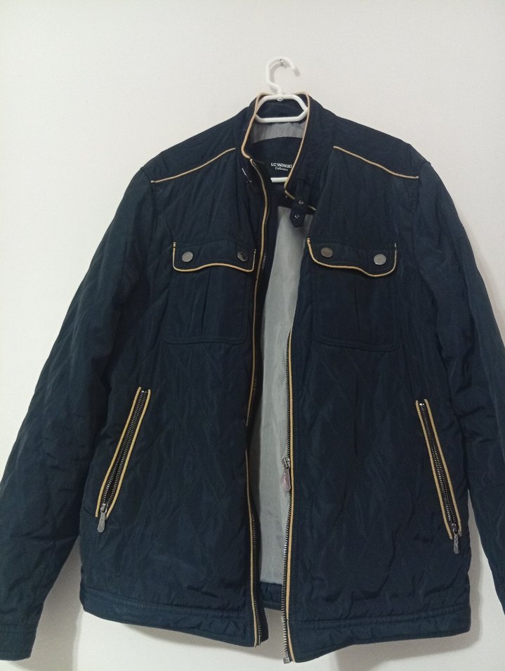 Siyah kot kumaştan yapılmış erkek ceket, fermuarlı ve çıtçıtlı ceplere sahiptir. Notlu yaka ve uzun kolludur, günlük ve sokak stili için uygundur.