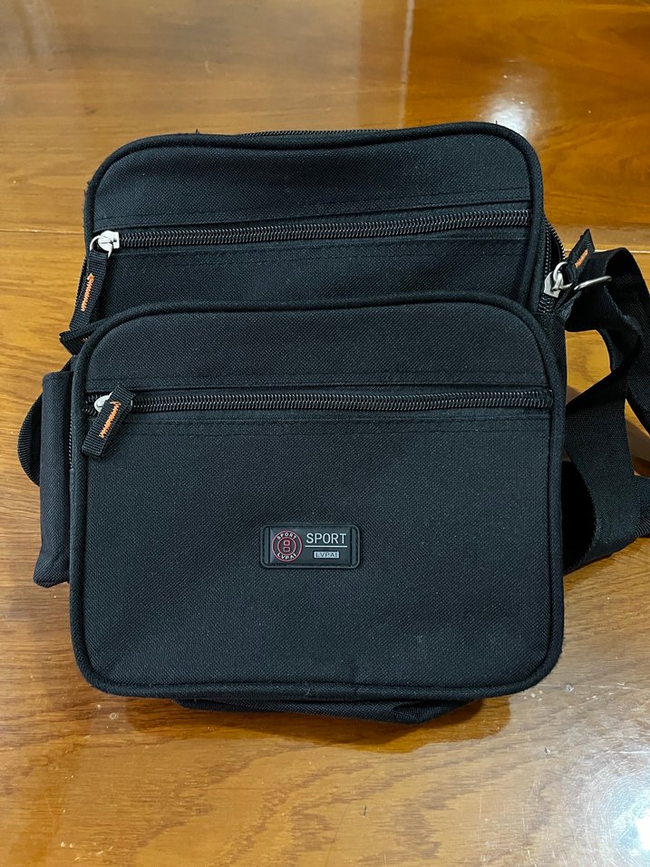 Siyah, fermuarlı bölmeleri olan erkek omuz çantası. Basit tasarımlı, 'SPOR' etiketi bulunur. Sokak ve iş stiline uygun.