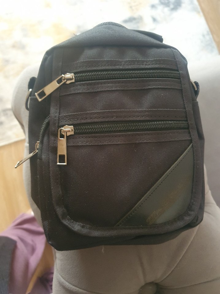 Siyah renkli, fermuarlı ceplere sahip erkek omuz çantası, sokak tarzına uygun sade ve kullanışlı bir tasarımdır.