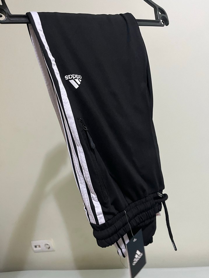 Siyah renkli, fermuarlı cep detaylı, sentetik kumaştan üretilmiş erkek outdoor eşofman altı. Beyaz yan şeritleri ve midi boyu ile spor ve sokak stili için uygundur. ♂️